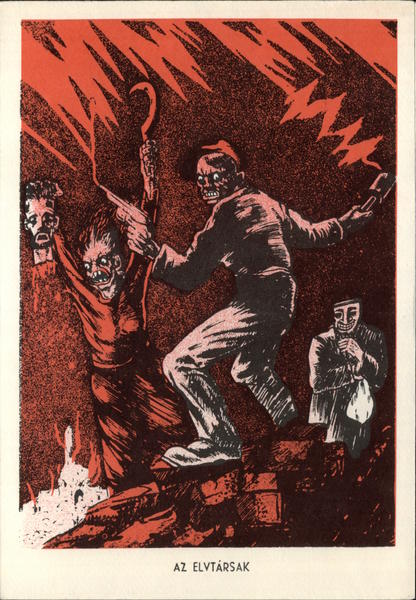 Front: AS ENE AZ ELVTÁRSAK Back: Antibolsevista levelezőlap-sorozat Szenko kiadás, Budapest, IX, Üllői ut 25 2228 Csak 3 filler a portó, ha keltezésen és névalairá- sokon kivül 5 üdvözló szót irunk Minden jog fenntartva Felelős kiadó Dr Ágh László