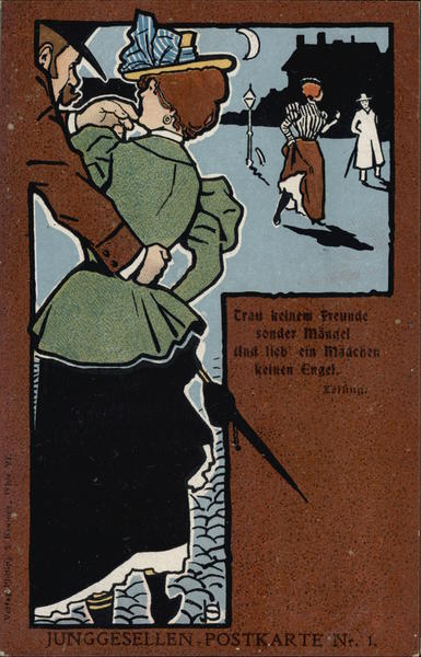 "Don't trust the friends, special of lack and dear girl is no angel. Lefung." Man Cigarette Austrian "There be I now I poor Thor. Goether." Tobacco, smoking. Couple Umbrella Note Austrian "Est is an old history remains eternally again it nevertheless. Geine." Artist signed J. S. Published by Phillip & Kramer. |
