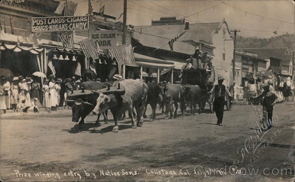 Front: POST CARDS CIGARS DRUGS KODAKS-CANDY. ICE CREAM TODA Prize winning entry by Native Sons. Calistoga, Cal. July 4th Col 10. ANISTOGACA Back: JA ADOTELIAS ADAMS (CALISTOGA BLINDSTA!) NAPA POSTAGP CO STAME asumbles 125-