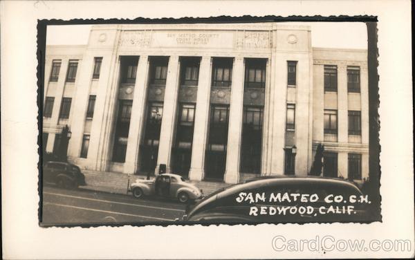 Front: SAN MATEO COUNTY COURT HOUSE ERECTED A D 1939 SAN MATEO CO.C.H. REDWOOD, CALIF. Back: H. B. ROOD PHOTO. POULTNEY, VT. کی OUPONT Defender