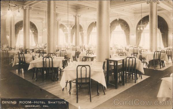 Front: DINING ROOM-HOTEL SHATTUCK -BEKKELEY, CAL. IN Back: - جی Hotel Shattuck BERKELEY, CALIFORNIA Direct service to Panama-Pacific International Exposition--45 minutes Post Grad Cosmo Pacific Photo Paper Co. S. E.