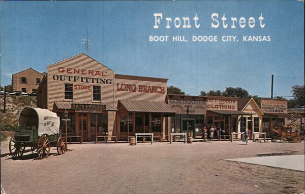 | Dodge City's famous old Front Street is reproduced in faithful replica on old Boot Hill. The board walks, the hitch racks, the awnings over the sidewalks, all are the same as in the days when this street was the main street of the "wickedest little city in the West." |