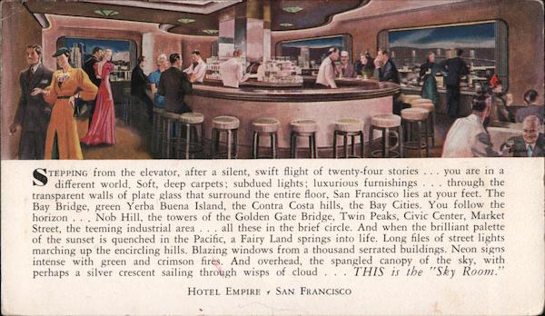 | Stepping from the elevator, after a silent, swift flight of twenty-four stories... your are in a different world. Soft, deep carpets; subdued lights; luxurious furnishings... through the transparent walls of plate glass that surround the entire floor, San Francisco lies at your feet. The Bay Bridge, green Yerba Buena Island, the Contra Costa HIlls, the Bay Cities. You follow the horizon... Nob Hill, the towers of the Golden Gate Bridge, Twin Peaks, Civic Center, Market Street, the teeming industrial area... all these in the brief circle. And when the brilliant palette of the sunset is quenched in the Pacific, a Fairy Land springs into life. Long files of street lights marching up the encircling hills. Blazing windows from a thousand serrated buildings. Neon signs intense with green and crimson fires. And overhead, the spangled canopy of the sky, with perhaps a crescent sailing through wisps of clouds... this is the "Sky Room". |