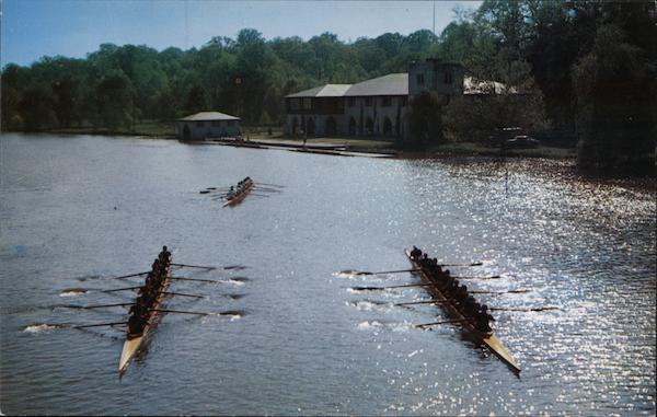 | Princeton University crews on the waters of Carnegie Lake, with the class of 1887 Boat House in the background. The lake 3 1/2 miles long, has a straightaway racing course 1 3/4 miles in length. Formed by damming the Millstone River, it was given by Andrew Carnegie in 1906. |