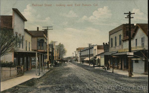 Front: Railroad Street looking west, East Auburn, Cal. HARNES s' CORNER + FRONT. NAL SE LAL49 Back: 30- PNC Nc 1c 2c No. 417 Publ. by S. G. Watts, East Auburn, Cal.