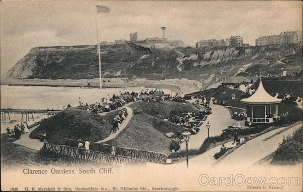 Front: Clarence Gardens, South Cliff. 1040. G. R. Marshall & Son, Booksellers & c., St. Nicholas Str., Scarborough. Back: POST & CARD. Only the if sent Abroad. khac For INLAND Postage only this space may be used for communication.