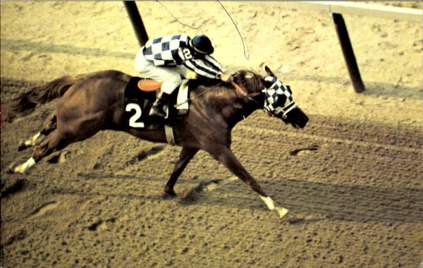 The Meadow Stable's Secretariat in full stride as he nears the finish line in the 1973 Belmont Steakes with jockey Ron Turcotte up. The colt won the race by 31 lenghts and set a track and stakes record for the mole and a half of 2:24, also an American rec |