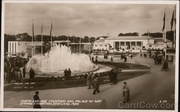 Front: SCOTTISH DAILY rRN VORTH CASCADE FOUNTAIN AND PALACE OF ART EMPIRE EXHIBITION, SCOTLAND. 1938. X.77. Back: VALENTINE & SONS LTD., DUNDEE AND LONDON OFFICIAL 10 VALENTU EXHIBITIO THIS IS A REAL PHOTOGRAPH ROUGHOR NTINE'S