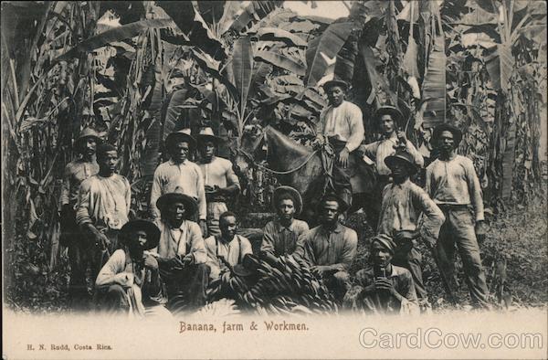 Front: Banana, farm & Workmen. H. N. Rudd, Costa Rica. Back: COSTA RICA Union postale Universelle. – Unión postal Universal. TARJETA POSTAL. (CARTE POSTALE.) Escribase de éste ladɔ la Dirección y la Comunicación del otro.