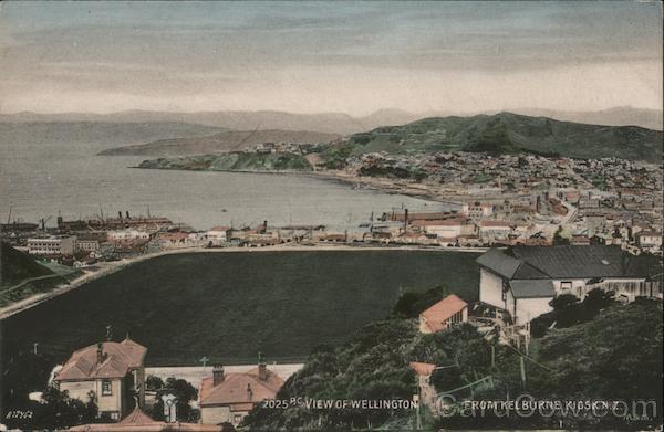 Front: 2025 PCVIEWOF WELLINGTON FROM KELBURNE KIOSK N.Z. A77462 M&M. Back: 1/2 d Inland 1 à Abroad Published by H. J. Hunter & Co., Wellington.