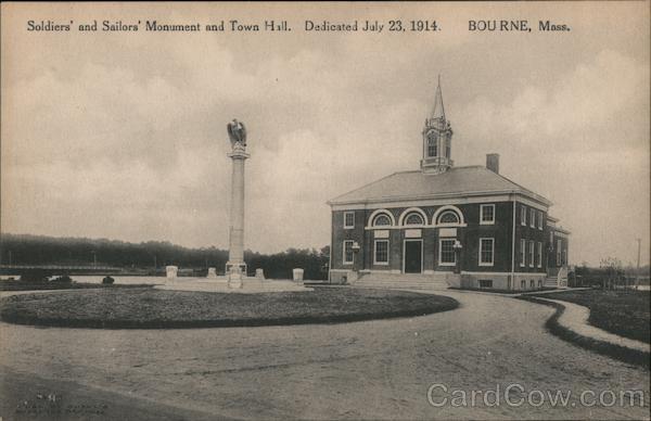 Front: BOU RNE, Mass. Soldiers' and Sailors' Monument and Town Hail. Dedicated July 23, 1914. III WIHK SHALL e Back: DER 3- .. 3 - Post Cards of Quailty. - The Albertype Co., Brooklyn, N. Y.