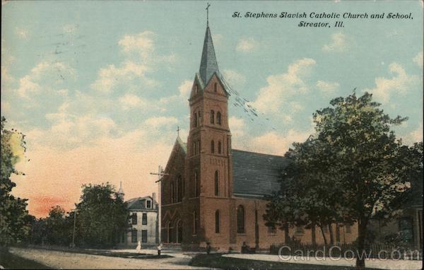 Front: St. Stephens Slavish Catholic Church and School, Streator, Ill. Back: AM Kro wi GREATO & Arrived a / CARD sound tak Orogett reo@dithandiena David met me 428 Collegarlo De Kalb, alle Emily A-12726