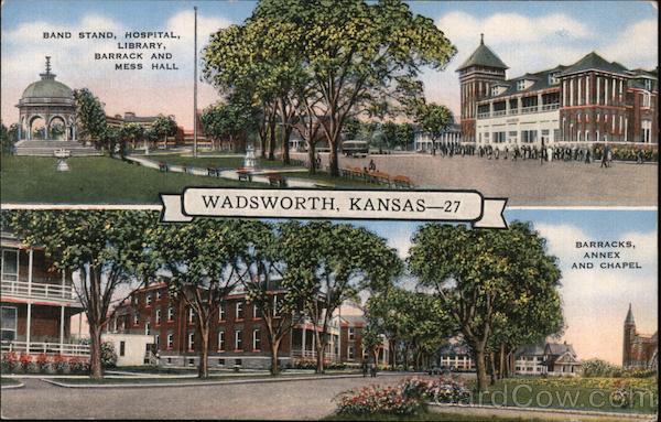 Front: BAND STAND, HOSPITAL, LIBRARY, BARRACK AND MESS HALL WADSWORTH, KANSAS–27 BARRACKS, ANNEX AND CHAPEL VEEL EEE Back: Со 9987
