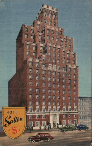 Front: 77171 211117 Satton S. Back: E-8101 HOTEL SUTTON 330 EAST 56th STREET NEW YORK 22, N. Y. Restaurant Bar Cocktail Lounge Swimming Pool and Roof Garden Designed and Produced by Harry H. Baumann, 254-6 W. 31st Street, New York 1. N. Y.