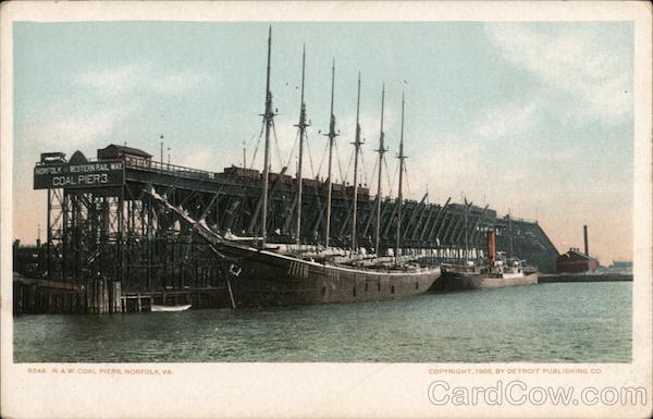 Front: NORFOLK YESTERX RAIL WAY. COAL PIER3 9244, N. & W. COAL PIERS, NORFOLK, VA. COPYRIGHT, 1905, BY DETROIT PUBLISHING CO. Back: and Canada. Foreign. Two Cents.