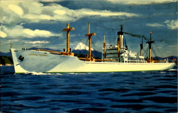 Front: HONGKONG TRANSPORT Back: S. S. HONG KONG TRANSPORT In Japanese Waters. Sacred Mount Fuji in background. YOUR 18 KNOT WHITE CARGOLINER