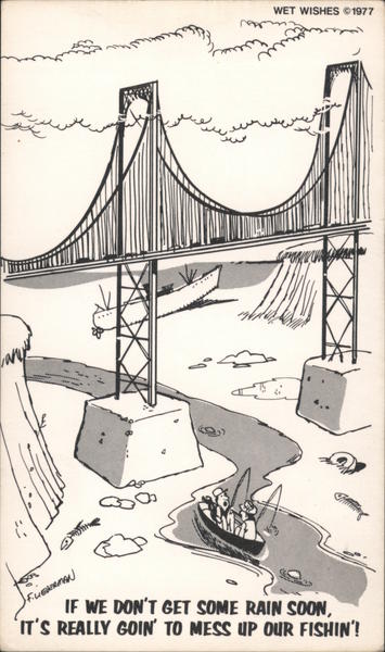 Front: WET WISHES ©1977 an 11 fiuERERMAN IF WE DON'T GET SOME RAIN SOON, IT'S REALLY GOIN' TO MESS UP OUR FISHIN'! Back: SF DROUGHT 1977 7 for zo سه .E
