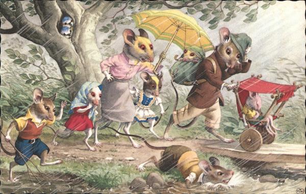 Mouse Family Hurries Home Through the Rain