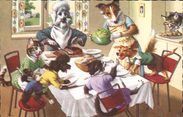 Anthropomorphic dog family serving dinner