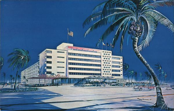 One block to good shopping. Frequent bus service. Free parking, chaise lounges. Dancing and entertainment. 200 beautiful rooms with refrigerators and balconies. Large studios with kitchens. Air conditioned and heated. Coffee shop and dining room. Open all year. |