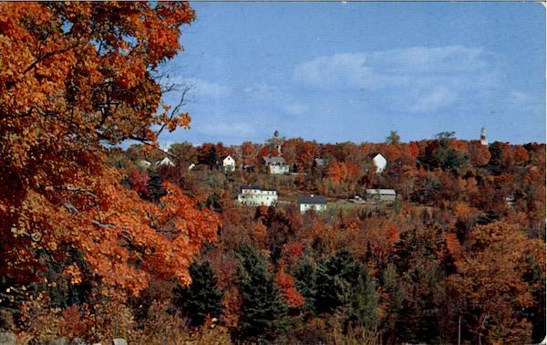 NEW LONDON, N.H. IS BEAUTIFULLY SITUATED ON A HIGH ELEVATION (ALT. 1326 FT.) SURROUNDED BY NEARBY MOUNTAINS. IT IS SHOWN HERE IN A FALL SETTING AS VIEWED FROM OLD MAIN STREET.