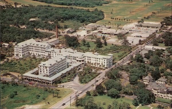 | A bird's eye view of the famous Ormond Beach Hotel, Ormond Beach, Fla...at one time the World's largest wooden structure. The ultra-modern Ellinor Village Country Club & Golf Course in the background, bordered by the Atlantic Ocean. A section of the Lavin Casements Hotel, formerly a Rockefeller Estate, seen in the lower left corner. |