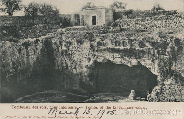 Front: Tombeaux des rois, cour intérieure. Tombs of the kings, inner-court. Merch 15. 19os. Dimitri Tarazi & Fils, Beyrouth. Damas. Férsalem. No. 438 Back: Turquie. Union Postale Universelle. Carte postale.