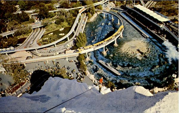 A panoramic view of Tomorrowland as seen from high atop mighty Matterhorn Mountain. As an alpine climber approaches the summit, far below a sleek Monorail train crosses the Submarine Lagoon on a journey through the "World of the Future".