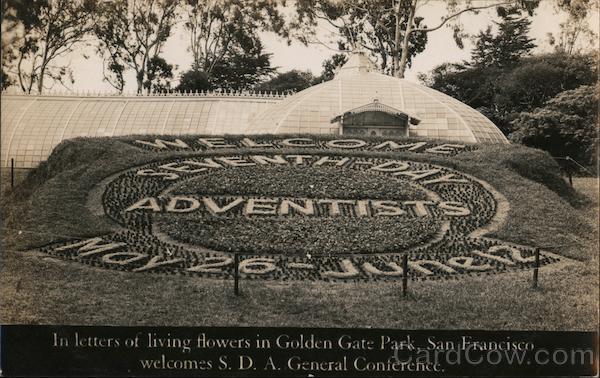 Front: ADVE NTIS In letters of living flowers in Golden Gate Park, San Francisco welcomes S. D. A. General Conference. Back: وه 2 A 2 O STAMP3 D A 2 оо