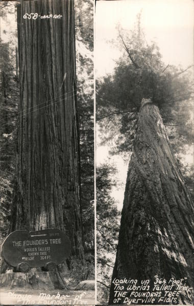 658-cat aay 300 FT. THE FOUNDER'S TREE WORLD'S TALLEST KNOWN TREE 364 FT. HEICHT Paore marker H OUhdors Tree Kooking up 364 Foet The Worlds Tallest Tre- THE FOUNDERS TREE of Dyerville Flais