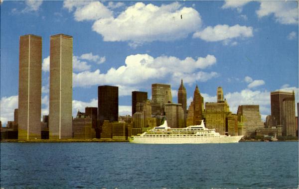A SPECTACULAR VIEW OF THE WORLD TRADE CENTER. A COMPLEX OF BUILDINGS INCLUDING TWO HUGE TOWERS. 110 STORIES HIGH-THE TALLEST BUILDING IN NEW YORK
