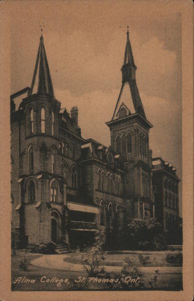 Front: Alma Collepe, SA Thoma, Ont. Back: MADE IN CANADA DESIGN REGIST. Printed by The Heliotype Co., Ltd.. Ottawa.
