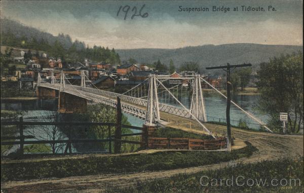 Front: Suspenslon Bridge at Tidioute, Pa. 1926 DRIVING FASTER THEW CAOSEND/-IDAL PAND 9739 Back: Copyright & Published by J. R. Binder, Tidioute, Pa. Made in Germany