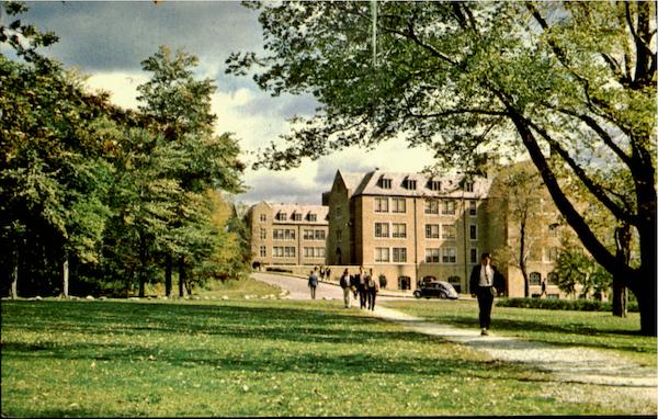 | TWO OF THE FIRST CLASSROOM BUILDINGS ON THE UNIVERSITY CAMPUS, XAVIER HALL ( LEFT BACKGROUND) AND BERCHMANS HALL (RIGHT BACKGROUND) STAND AS IMPOSING STRUCTURES IN COLLEGIATE __ AT THE NORTH BENSON ROAD ENTRANCE TO THE CAMPUS . X__ HALL HOUSES UNIVERSITY CLASSROOMS AND LABORATORIES, BERCHMANS HALL SERVES AS A CLASSROOM BUILDING FOR EAIRFIELD COLLGE PREPARATORY SCHOOL. |