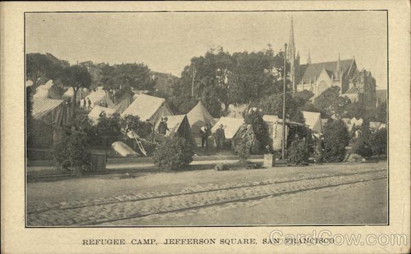 Front: REFUGEE CAMP, JEFFERSON SQUARE, SAN FRANCISCO Back: THE SPACE ABOVE IS RESERVED FOR POSTMARK T. H. Spaulding, Publisher, San Francisco. 15