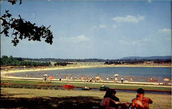 | SWIMMING SPEED BOATS AND WATER SKIING MAKE ROBIN LAKE BEACH ONE OF THE TOP TOURISTS AND VACATION SPORT IN THE DEEP SOUTH. BETWEEN PICNICKERS AND BEACH IS KINGFISHER CANA, WHICH LINKS TWO OF THE GARDENS 'ELEVEN LAKES. THE 2500 ACRE GARDENS FEATURE APPALACHION WILD FLOWERS IN THEIR NATIVE SETTING. ON U.S. 27 AT PINE MOUNTAIN, GEORGIA. 30 MILES NORTH OF COLUMBUS,GEORGIA. |