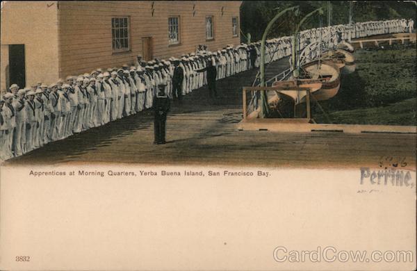 Front: وی. Apprentices at Morning Quarters, Yerba Buena Island, San Francisco Bay. Per 3832 Back: 6936 2- PER C. LO? CO CIL 2061 66443 Cara L. Perrine üaliey City, Lorth Dates Lara C. Perrine Calley City, David Dakota