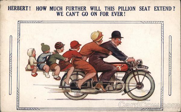 Front: HERBERT ! HOW MUCH FURTHER WILL THIS PILLION SEAT EXTEND ? WE CAN'T GO ON FOR EVER! 123 Back: No. 7018 DOMESTIC COMIC Printed in U. S. A. Bamforth Comic sy URED: KATIESOS