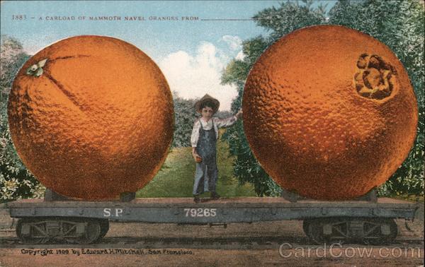 Front: 1883 -A CARLOAD OF MAMMOTH NAVEL ORANGES FROM S.P 79265 Copyright 1909 by Edurard H.mutchell Sen Frencisco. Back: MADE IN AMERICA BY EDW.H.MITCHELL AT SAN FRANCISCO.CALIFORNIA.