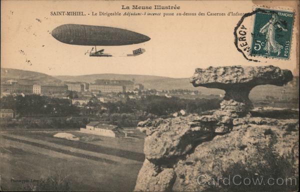Front: La Meuse Illustrée Act i FRANÇAISE SAINT-MIHIEL. Le Dirigeable Adjudani -F incenot passe au-dessus des Casernes d'Infant Phototyple Lévy POSTES Back: مواد مخدر M: SONDADO Holloni von