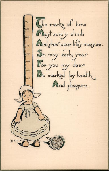 Front: The marko of time Myt surely climb And show upon lites So may each year dear measure . For you my or B. marked by health, And pleagure. ST © H.L.W. Back: HANDEMBOSSED **。 H. L. WOEHLER, NEW YORK (Made in Germany. )