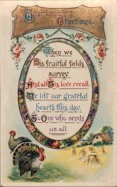 Front: Greetinas. Cahen we Dis fruitful fields Survey Tnd allDis love recall. Ge lift our grateful hearls this day. 6-One who sepds Us all. Back: ng POST CARD. OOD ON THIS SIDE. PRIMIER: IN GERMANY Series No. 2484