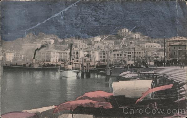 Como is one of the beautiful Swiss Lakes, so renowed in story, and considered one of the gems of the beautiful series of lakes known as the Interlaken in the Swiss Alps. This picture represents the terminus of the Funnicular Railroad, known to every tourist in the world. This Railroad can be seen climbing the side of the Alps in the distance |