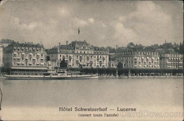 Front: SCHVET Hôtel Schweizerhof Lucerne (ouvert toute l'année) Back: 10 IN Lir 27V110g - 8 27.09.=8 BRF AUFS Here's where we e ataying Tha Frankli loonies, Elizabeth St. Debat zet С. Conn Papeterie Wega, Lucerne U. S. A.
