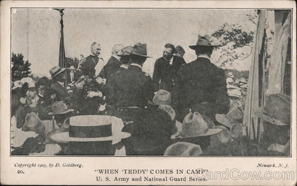 Front: Copyright 1905, by D. Goldberg, Newark, N. J. 20. "WHEN 'TeddY' C OMES IN CAMP" U. S. Army and National Guard Series. Back: 1750 RR here, POST CARD. . Foreign, Two