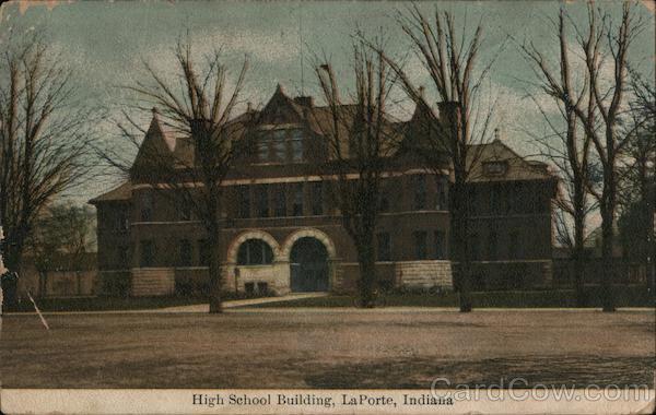 Front: High School Building, La Porte, Indiana Back: ONE GENT 3.50 LAPORA St JUL 1 9-30P THIS SPACE MAY BE USED FOR COR19ONDENCE2 IND sa matice Dead 467" ori BU other Wi- This is morgen yol Gorm Center Wizare Azey