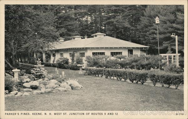 Front: PARKER'S PINES, KEENE, N. H. WEST ST. JUNCTION OF ROUTES 9 AND 12 B-718 Back: GLOSS TONE DINNERS and LUNCHES DELICIOUS HOME COOKING ALWAYS WELCOME MFD. BY FORT WAYNE PRINTING CO., FORT WAYNE, IND.