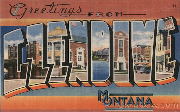 Front: Greetings 44 F ROM- CORDA ROSE ONTANA Back: GLENDIVE, MONTANA N. P. Depot City Hall U. S. Post Office Yellowstone Bridge High School Main Street POST CARE THE HAFSTROM CO., PUBLISHERS, BELFIELD, N. D. MADE IN U. S. A. 74960