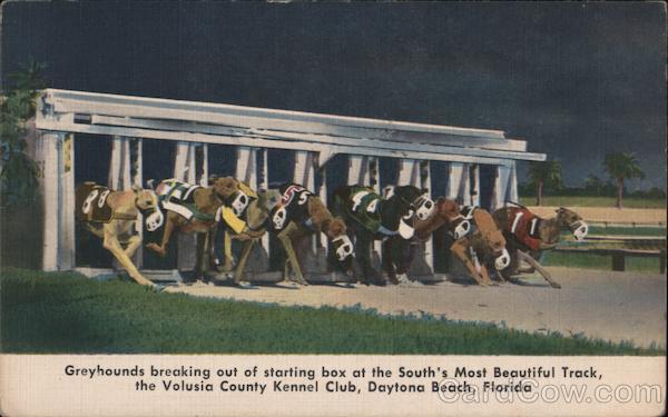 Front: 5. 11 Greyhounds breaking out of starting box at the South's Most Beautiful Track, the Volusia County Kennel Club, Daytona Beach, Florida Back: K8434 A "COLOURPICTURE" PUBLICATION. BOSTON 15, MASS., U.S.A.