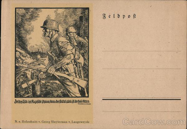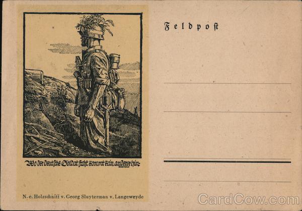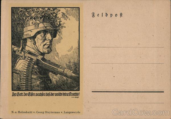 Feldpost Wo der deutsche Soldat steht, kommt kein anderer hin. German WWII Propaganda, "Soldier in the Field" German WWII Propaganda, "The Soldier Does Not Fear Death" German WWII Propagnda, "God, Who let Us Make Iron, Wants No Slaves" E. M. Arndt: Der Gott, der Eisen wachsen ließ Der Gott, der Eisen wachsen ließ, der wollte keine Knechte! E. M. Arndt N. e. Holzschnitt v. Georg Sluyterman v. Langeweyde |